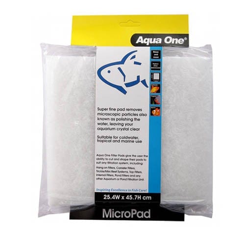 The Aqua One Micropad is a tightly woven mechanical filter pad designed for removing fine/course free floating particles from your aquarium. This prevents the biological media from becoming clogged, decreasing the risk of disease and stress on fish. It also ensures crystal clear water.