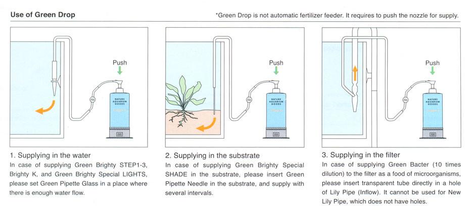 ADA Green Drop is a glass equipment for liquid fertilizer and you can enjoy supplementation process. You can also supply fertilizer into the substrate directly with attached needle type.