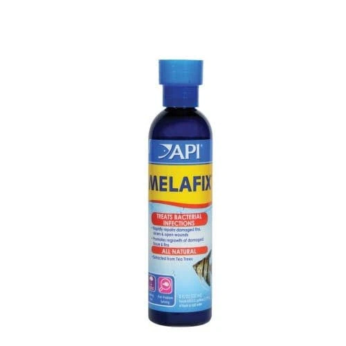 API Melafix is an all-natural antibacterial treatment that works to treat infections in fish. Common bacterial infections are open wounds and abrasions, tail rot, eye cloud, and mouth fungus. API Melafix also promotes regrowth of damaged fins and tissue. Product may be used when adding fish to an aquarium – particularly to smooth the transition from store to home – and if an infection is suspected, but not yet diagnosed. Some fish bought in pet stores are already carrying diseases at the time of purchase, which may be difficult to detect in its early stages.