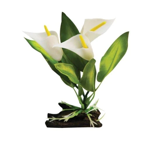 AQUA ONE PLASTIC PLANT – CALLA LILY WITH LOG BASE SMALL 12CM