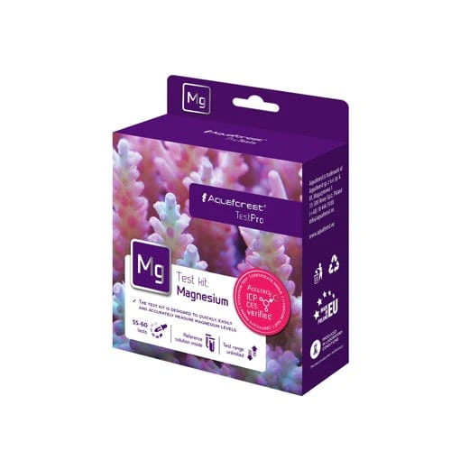 Aquaforest TestPro Magnesium is designed to quickly measure the concentration of Magnesium (Mg) in marine water. Magnesium plays an important role in many biological processes, e.g. takes part in the construction of hard coral’s calcium carbonate skeleton. Due to its unique chemical properties it has significant impact on seawater buffering capacity, and also prevents excessive precipitation of calcium carbonate on aquarium equipment.