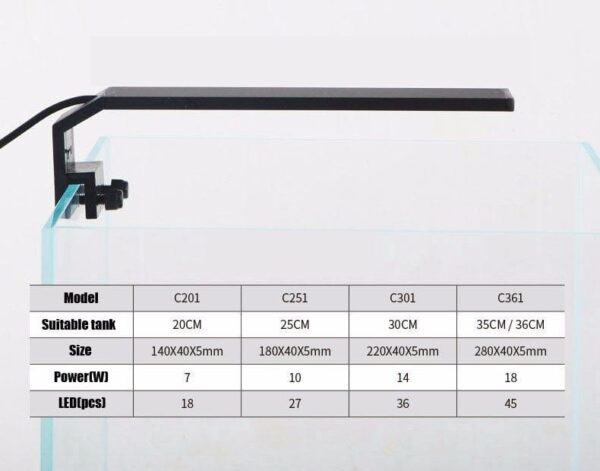With the Series C lamp Chihiros also has the fitting lighting solution for all nano tanks from 10l to 30l. The even distribution of the LEDs ensures a perfect illumination of the tank, while the waterproof design makes these lamps specially durable. It is easily mounted to tanks with a thickness of up to 6 mm with a practical srew mounting. The perfect lighting for every nano tank.