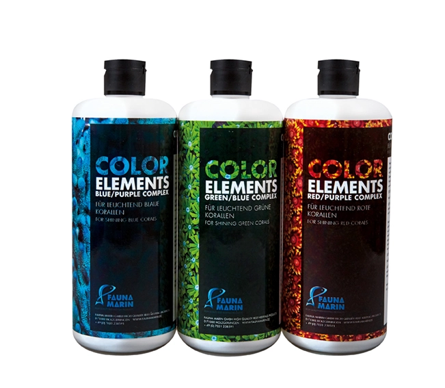 Color Elements are a novel mix of growth and color enhancing trace elements based on a unique and experimentally confirmed recipe which perfectly adapts to modern artificial sea salt mixes. Developed by leading scientists, this state-of-the-art element aligns the micro-nutrient consumption of tropical corals with the environmental light conditions generated by LED lighting systems. It allows for stable conditions in the micro-nutrient budget in coral reef aquaria, and thereby significantly increases coral growth rates and coral coloration. Due to the special formulation of the elements this mix does not lead to the accumulation of excess toxic trace metals in the aquarium and effectively prevents the growth of unwanted algae.