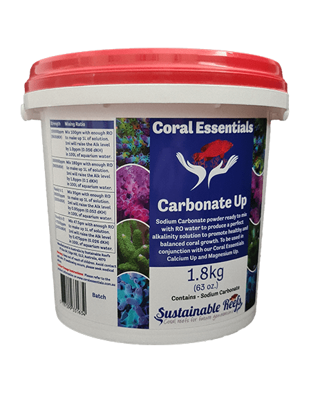 Our Coral Essentials Carbonate Up is concentrated Sodium Carbonate anhydrous granules at minimum 99.2% purity, in a handy 1.8kg bucket. For those marine reefers with large tanks it is an extremely cost effective way of providing your carbonate/alkalinity dosing. You can follow our simple recipe to make up solutions at 180,000ppm to match the carbonate concentration of our renowned Carbonate + Trace pre-mix liquid solution, the full bucket makes up 10L at 180,000ppm. You can also use the familiar Randy’s 1 and 2 mixes. All instructions for the above are detailed on the bucket itself. Then simply add our Power Trace C, Bromide and Boron for the complete carbonate dosing additive with essential trace elements. For optimum results the alkalinity (KH) levels in marine tanks need to be checked regularly to determine the uptake in your system. Simply calculate dosing requirements to suit the depletion rate. After you have determined this, a regular check of the alkalinity levels should be made. Your tank will change over time as coral grows, new pieces are added as well as invertebrates that also take up carbonate. We have found ideal KH levels to be at about 8-9 dKH for most aquariums. Levels of 8.5 – 9.0 dKH are desirable if you want to maintain high levels of growth in a SPS and hard coral dominant system.