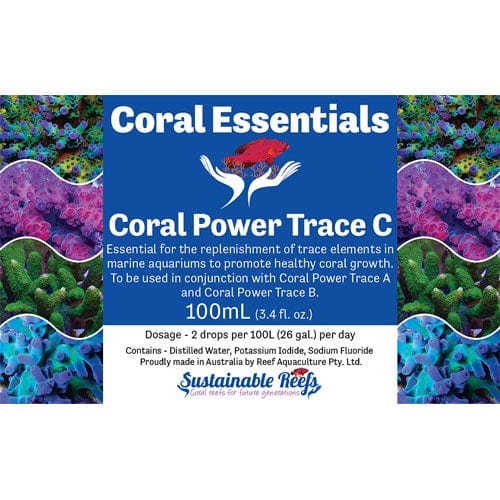Our Coral Essentials, Coral Power Trace C is a blend of Potassium Iodide and Sodium Fluoride. It provides a complete blend of Iodine and Fluorine for the marine environment. These trace elements are depleted by healthy coral and regular use is required to maintain growth and colouration.