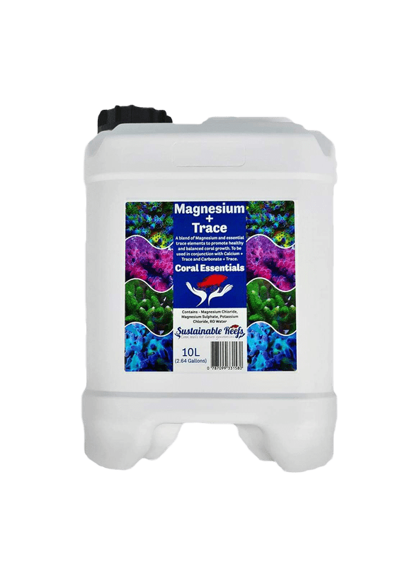 Our Coral Essentials, Magnesium + Trace is a concentrated source of liquid magnesium, 12,500 ppm (mg/L)  and our own unique blend of Potassium. We have added our Coral Power Potassium into this mix using our proven Coral Essentials Method dosing regiment.