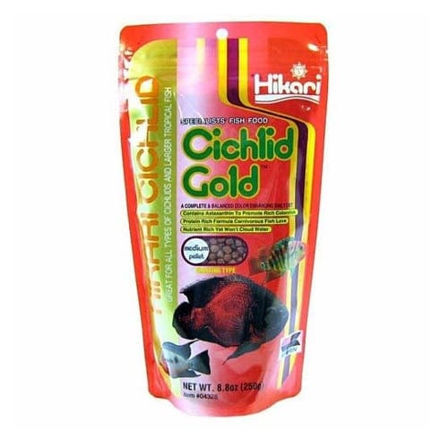 Hikari Cichlid Gold medium pellet is a floating colour enhancing food for Cichlids and larger tropical fish. Offers excellent growth rates through improved digestion and a high protein level. High in stabilized vitamin C which reduces stress and promotes immunity.