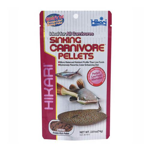 Hikari Sinking Carnivore pellets are a sinking tablet shaped pellet for bottom feeding carnivorous fish. The special formulation uses key ingredients like DL-methionine and Llysine to produce a food that the fish readily devour. Hikari Bio-Technology helped identify the highest grade carotenoid for enhanced colouring not usually available with indoor kept fish.