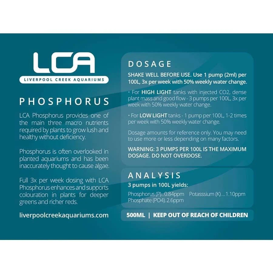 Phosphorus ( P ) is one of the main three macro nutrients (nitrogen, phosphorous, potassium: NPK required by plants and can often be overlooked in a planted aquarium. It has been inaccurately thought to ’cause algae’. Full 3x per week dosing with LCA Phosphorus will enhance and support colouration in plants , allowing deeper greens and richer reds.
