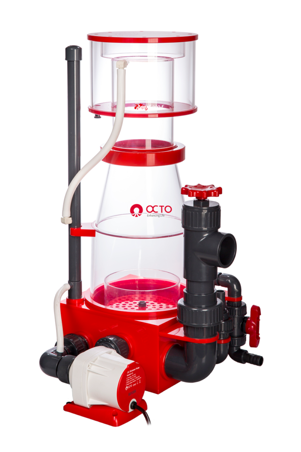 OCTO series Regal recirculating external protein skimmer (Regal -E) is an out-of –sump protein skimmer featuring high-quality cast acrylic body construction , easy disassembly for maintenance , a precision control gate valve and a hybrid conical body which helps to naturally stabilize and concentrate the organic rich foam as it rises . Water is recirculated within the skimmer for cleaner water output.