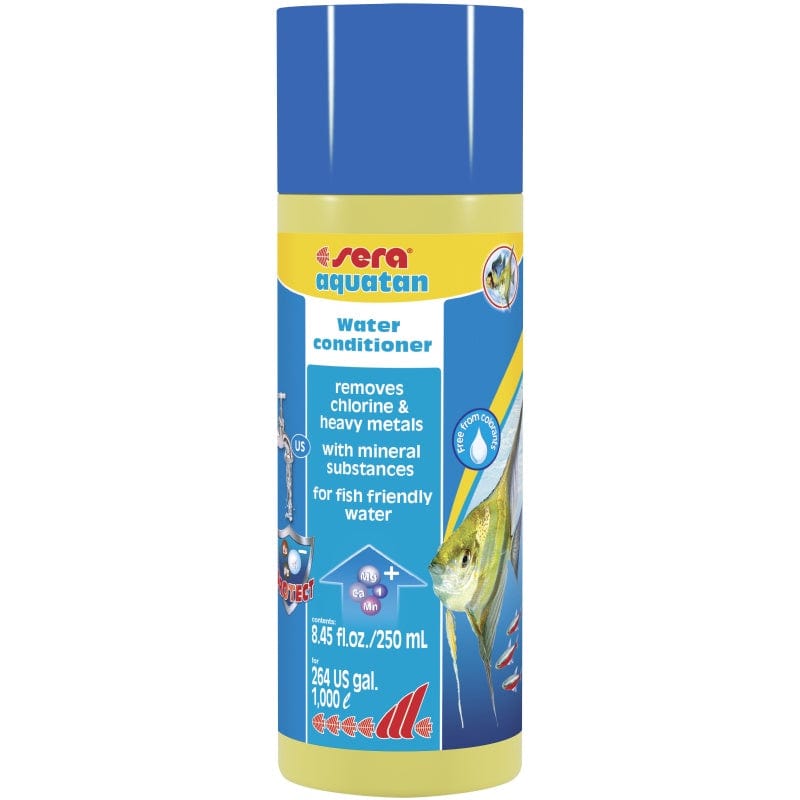 Sera aquatan immediately conditions tap water into fish friendly, healthy aquarium water. It removes harmful substances such as chlorine and chloramines, binds heavy metals (e.g. copper, zinc or lead) and protects against ammonia. At the same time, it adds important mineral substances in a bioavailable form to the aquarium water, which is to the benefit of fish, plants, invertebrates and useful micro organisms.