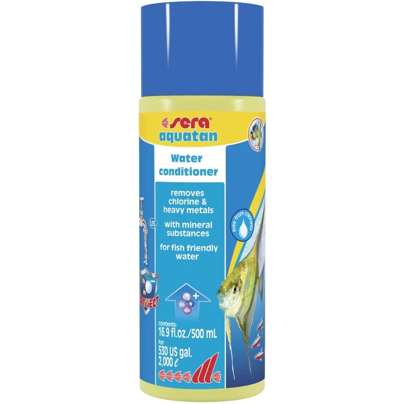 Sera aquatan immediately conditions tap water into fish friendly, healthy aquarium water. It removes harmful substances such as chlorine and chloramines, binds heavy metals (e.g. copper, zinc or lead) and protects against ammonia. At the same time, it adds important mineral substances in a bioavailable form to the aquarium water, which is to the benefit of fish, plants, invertebrates and useful micro organisms.