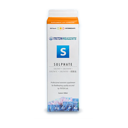 Sulphate macro element seawater supplement. Sulphate is an important element that naturally occurs in seawater. Beneficial for SPS/LPS coral colour and health. Caution: to be used by advanced aquarists only.