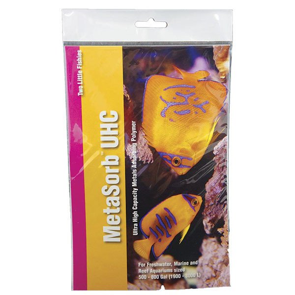 MetaSorbTM UHC is made with patented high capacity polymers developed for the US Environmental Protection Agency’s Superfund Program. Insoluble in water and nontoxic, the polymers rapidly bind and permanently remove metals from fresh and saltwater, making it possible to restore the water quality. MetaSorb UHC is a fine powder that is packaged in a small cloth media bag that is easy to locate in any area where high volume water flow will facilitate the contact with the polymer. Simply place the bag in any canister filter, hang-on-the-back power filter, or in flow-through sections of any sump or filter chamber. After a few days MetaSorb UHC can be removed, dried and stored for later use or discarded. For pretreating new water or newly mixed artificial seawater MetaSorb UHC may be reused several times.