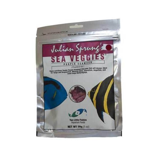 Julian Sprung’s SeaVeggies Purple Seaweed (Porphyra umbilicalis) are super nutritious natural purple seaweed sheets. Ideal for marine herbivores such as Tangs and Surgeonfish, Moorish Idols, Parrotfish, Angelfish, large Butterflyfish, and herbivorous freshwater fishes, such as cichlids and goldfish. Sealed in foil packaging for freshness.