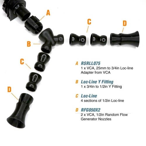 The The Ultimate Reefer Return Line Upgrade Kit is the easiest way to upgrade your Red Sea Reefer return line. This kit brings together all the parts you need to transform the return line in a way no other kit can. The RSRFK075 includes the VCA 25mm to 3/4in Slip-fit Loc-line Adapter, a loc-line Y fitting, a few sections of Loc-Line and two Random Flow Generators. The kit comes fully assembled and easily slips on to the end of the stock return nozzles – not tape, not tools, no glue required. It’s that easy and can completely transform your return line flow.